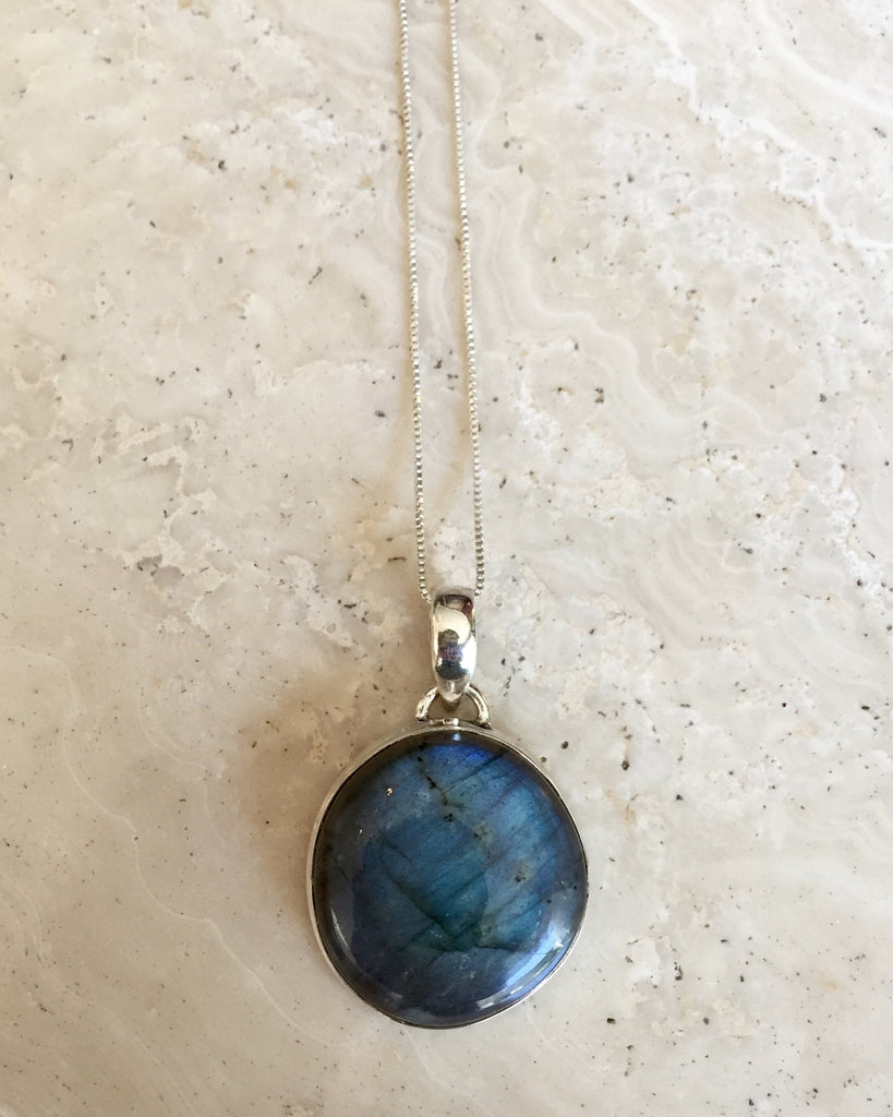 Stunning labradorite pendant with 18" sterling silver box chain.